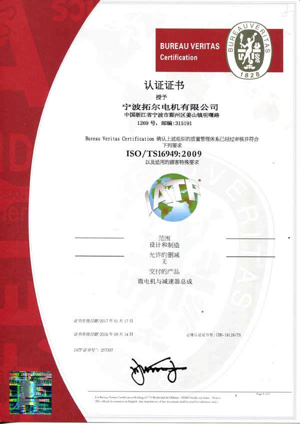 于2017年1月20日顺利通过了专家组的审核,成功取得了ISO/TSl6949:2009证书,这意味着拓尔电机顺利成为了汽车行业的合格零部件供应商。此次认证,同时也标志着拓尔电机在设计、制造、销售和服务等领域的质量管理水平已与国际同步接轨。